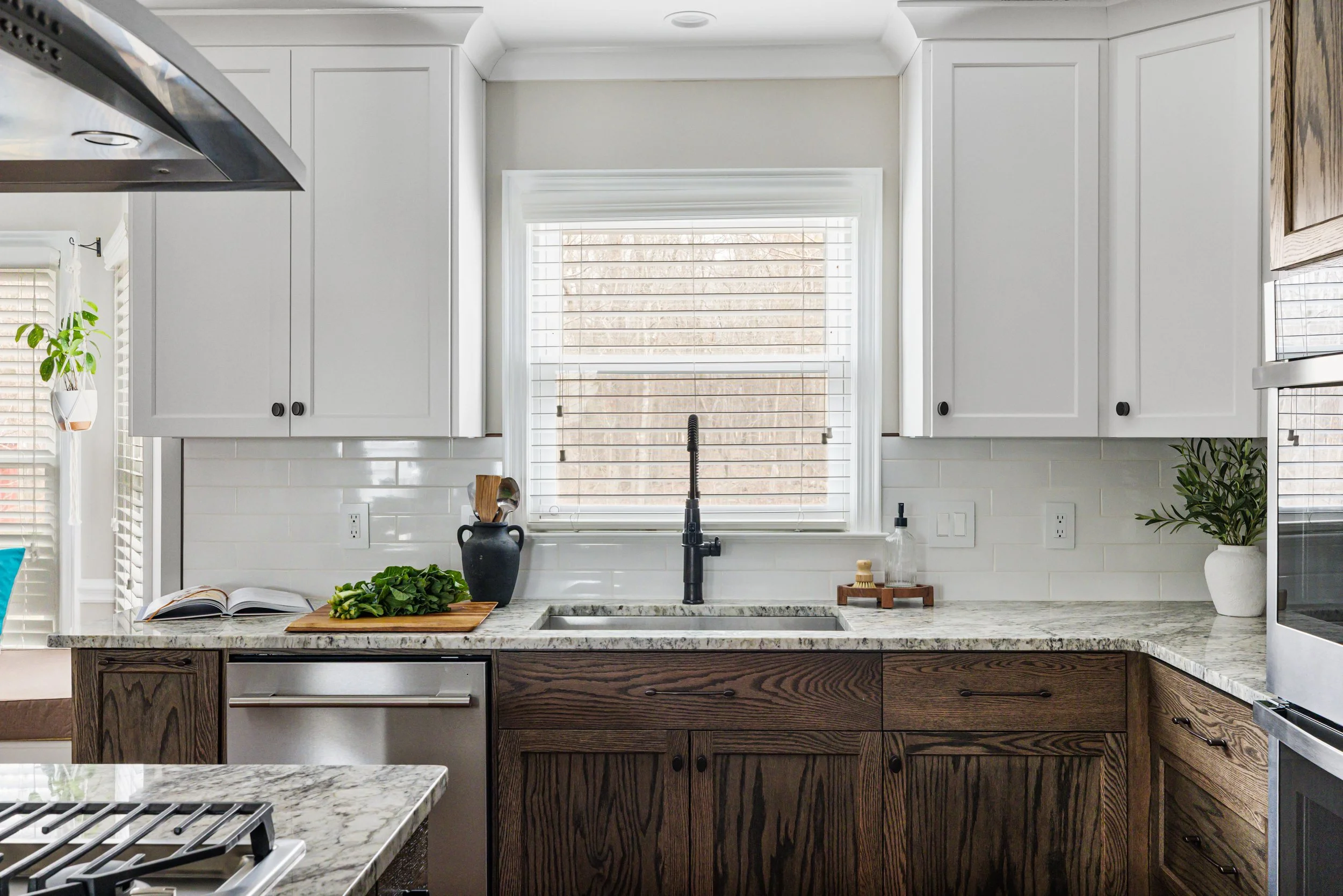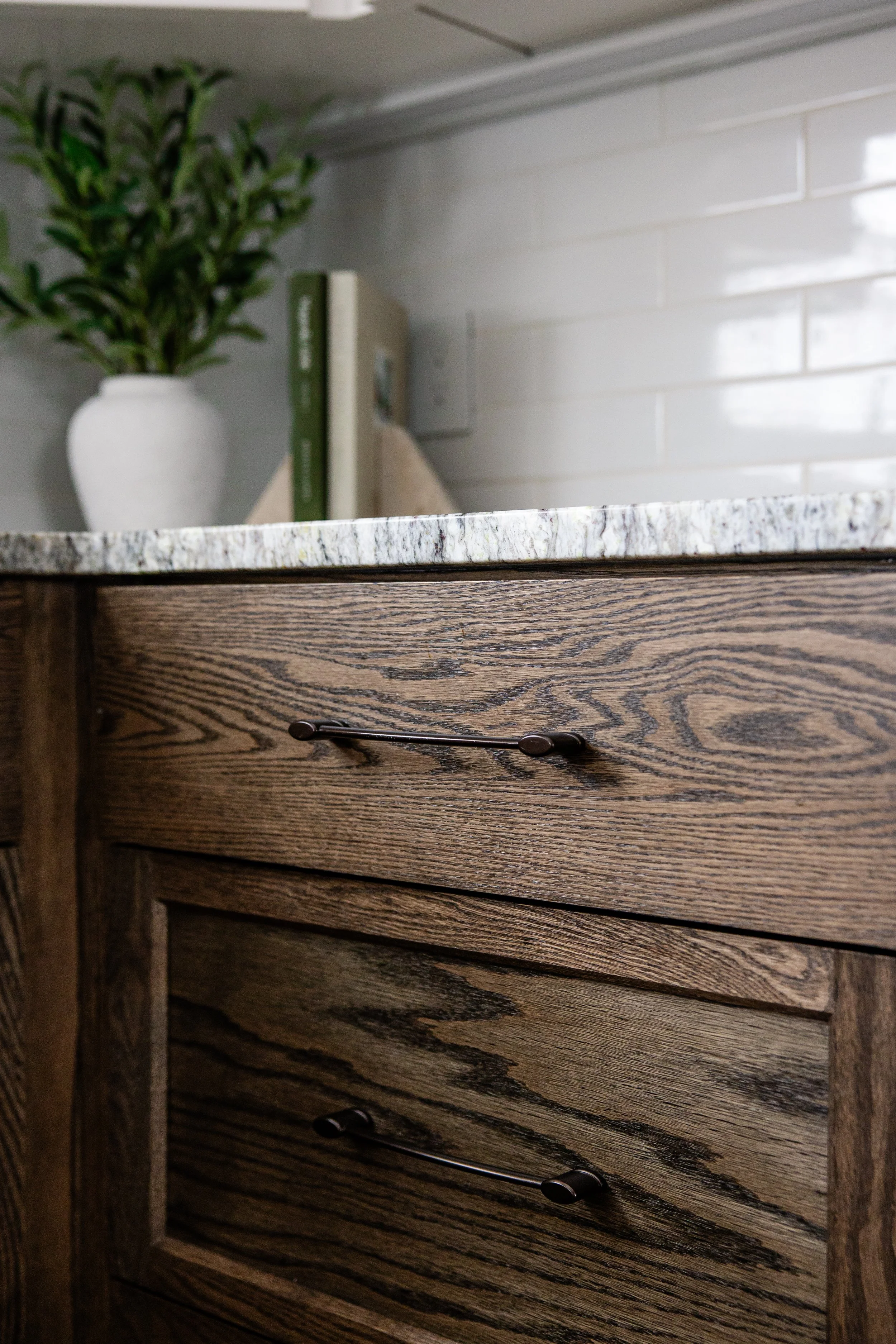 The clients wanted white oak, but not the version you're seeing everywhere right now. No light, airy finish. No overly warm tone. Instead, we worked with a darker, cooler custom stain that completely shifted the feel of the space. It still reads natural and still brings in texture, but in a way that feels more grounded and a little less expected. To balance the visual weight of the darker lower cabinets, we brought in off-white uppers and kept the backsplash minimal. When your floors, countertops, and cabinetry all have movement, something has to pull back and let the room breathe.