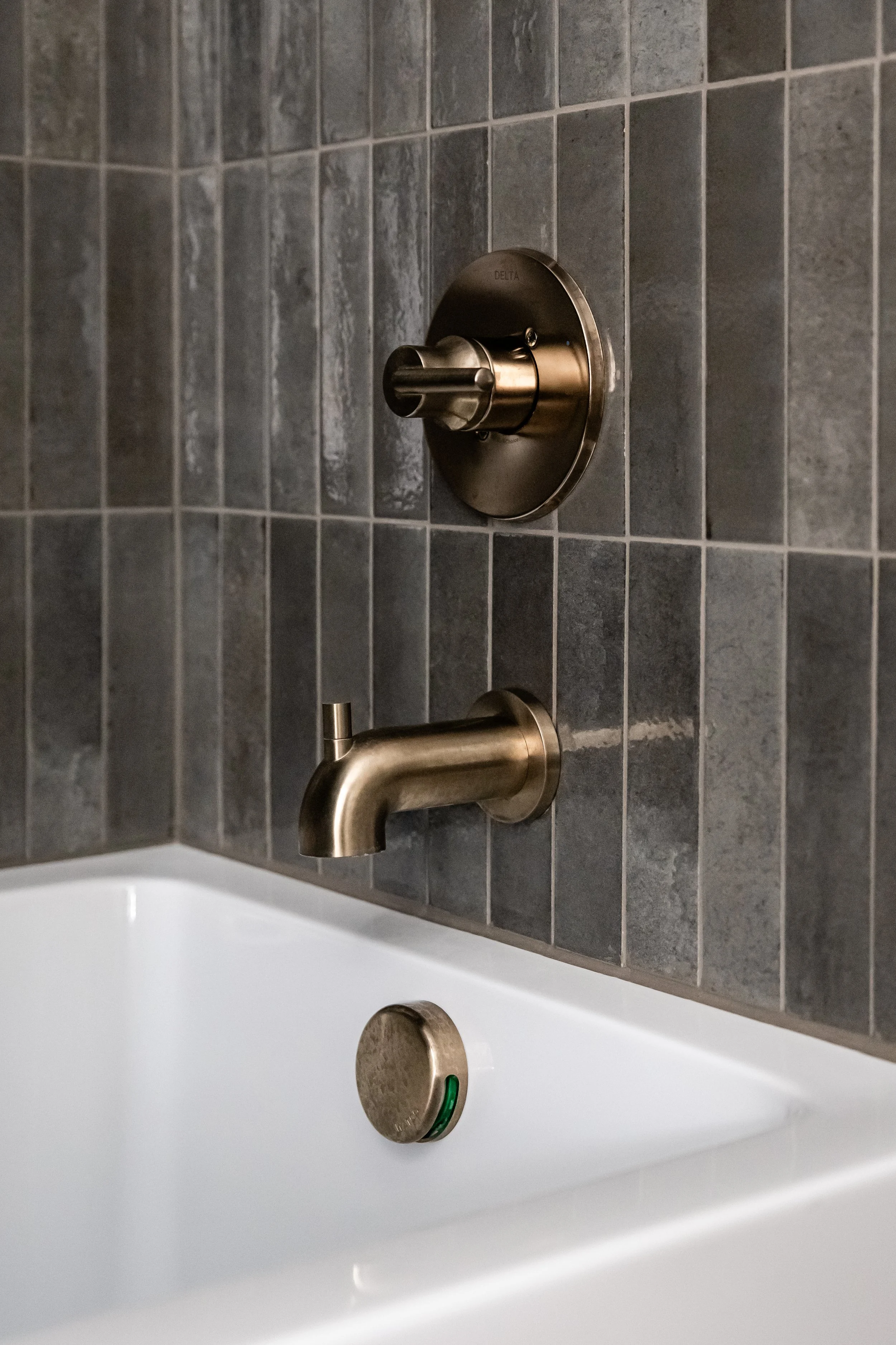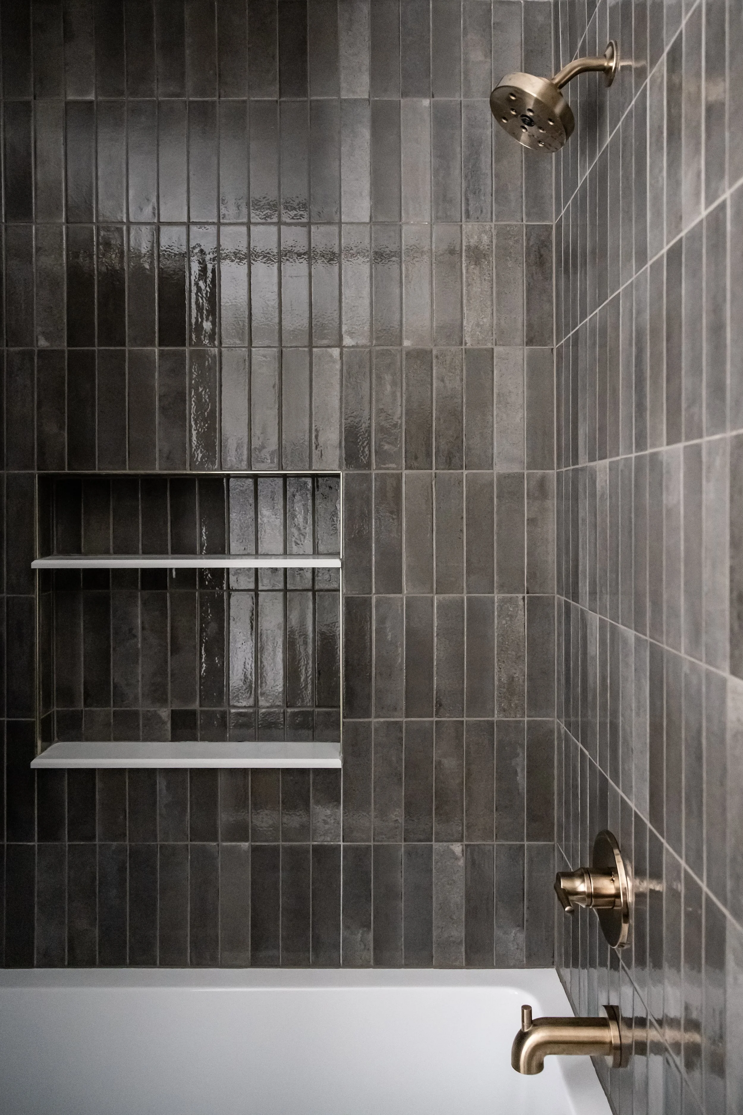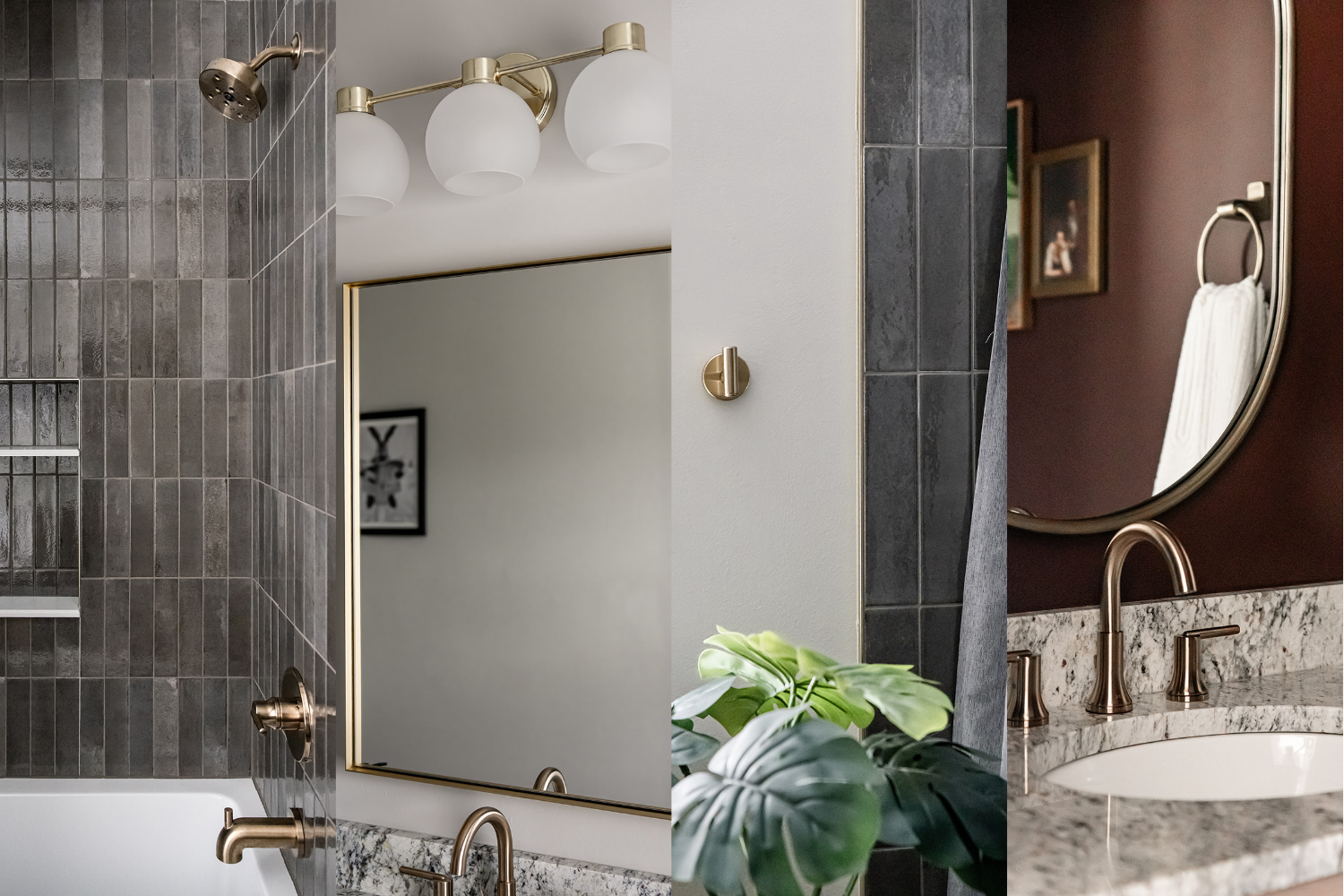 The tween bathroom got a bit more personality. We kept the layout functional with an oversized tub and shower combo, but layered in a vertical stacked tile in a mocha-gray tone and brought in brass globe lighting and a slightly more mid-century feel. It's a space she can grow into rather than out of, which is always the goal when designing for younger clients.
