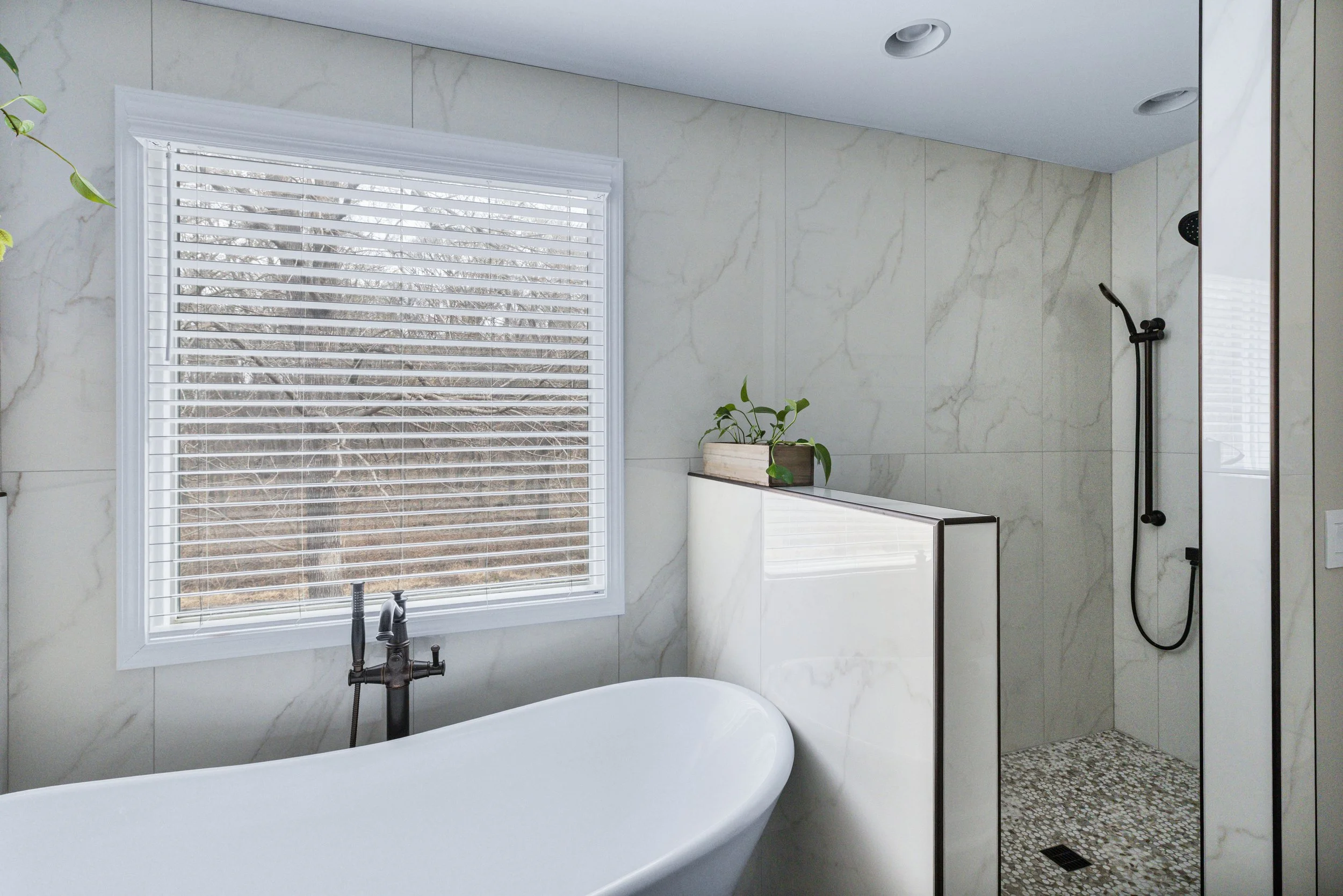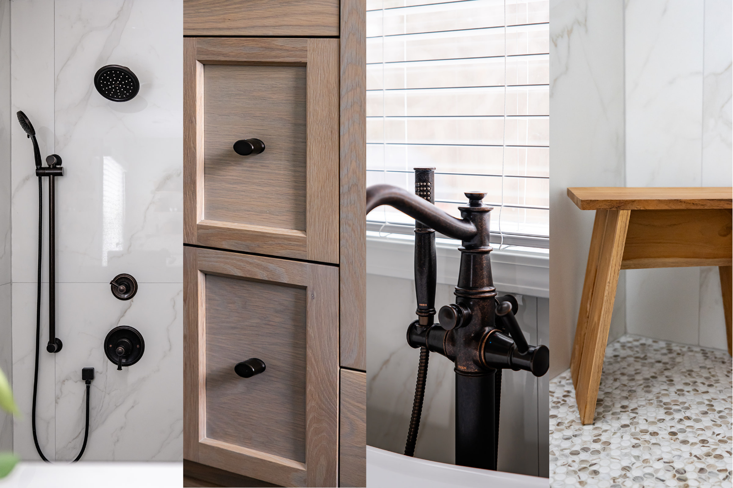 For both the primary and secondary baths, we chose large-format tile to minimize grout lines (a practical call, especially with hard water), kept the palette in soft whites and off-whites, and introduced white oak cabinetry with a gray-wash finish to cool things down without losing warmth. Slightly darker grout throughout adds longevity, because real life happens. The result feels clean without feeling sterile, and practical without feeling basic.