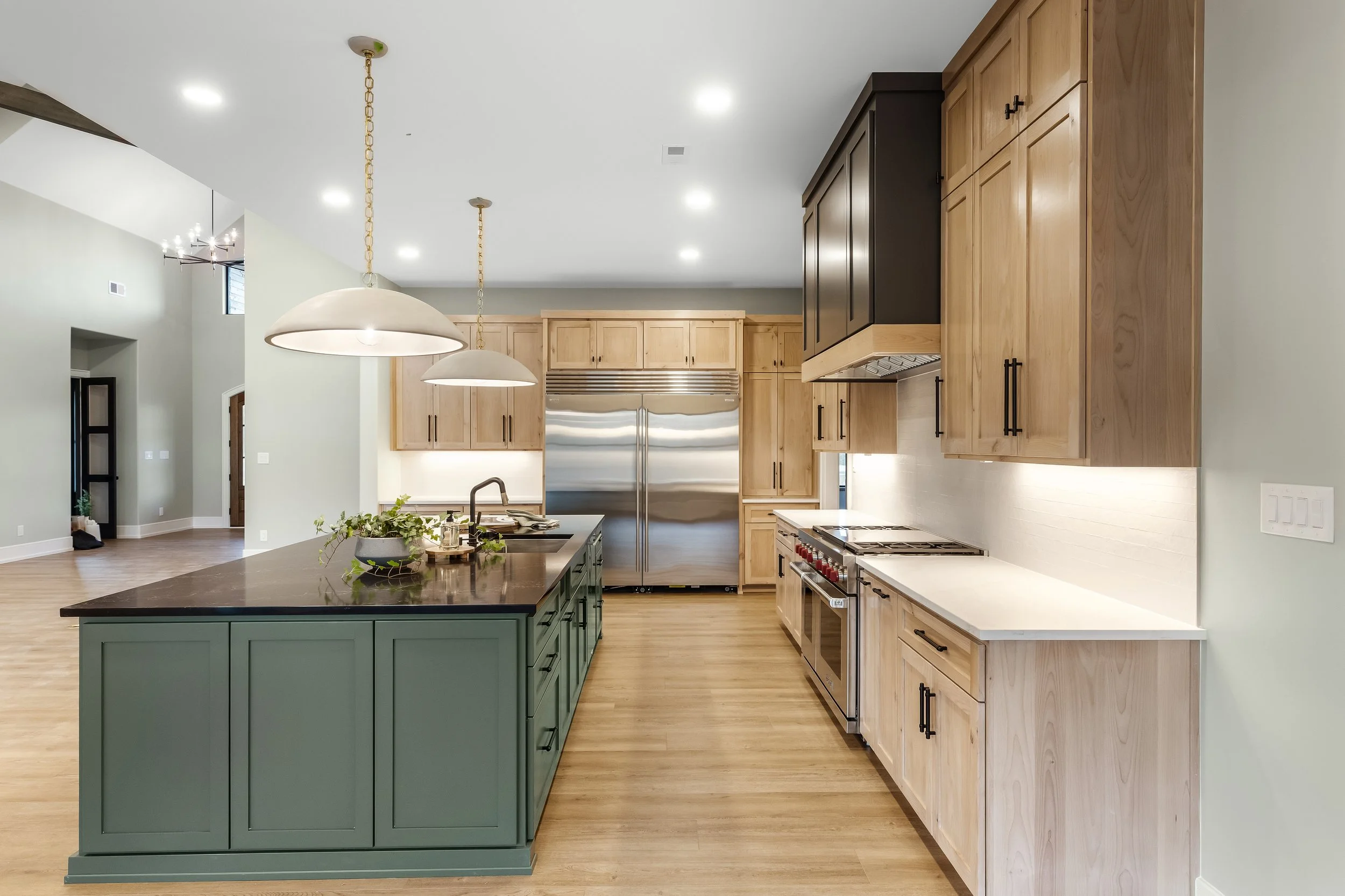 Natural maple cabinets line the perimeter in this Studio Lee kitchen while a contrast island in Sherwin Williams Rosemary makes a statement: all-white is out; warm is in.