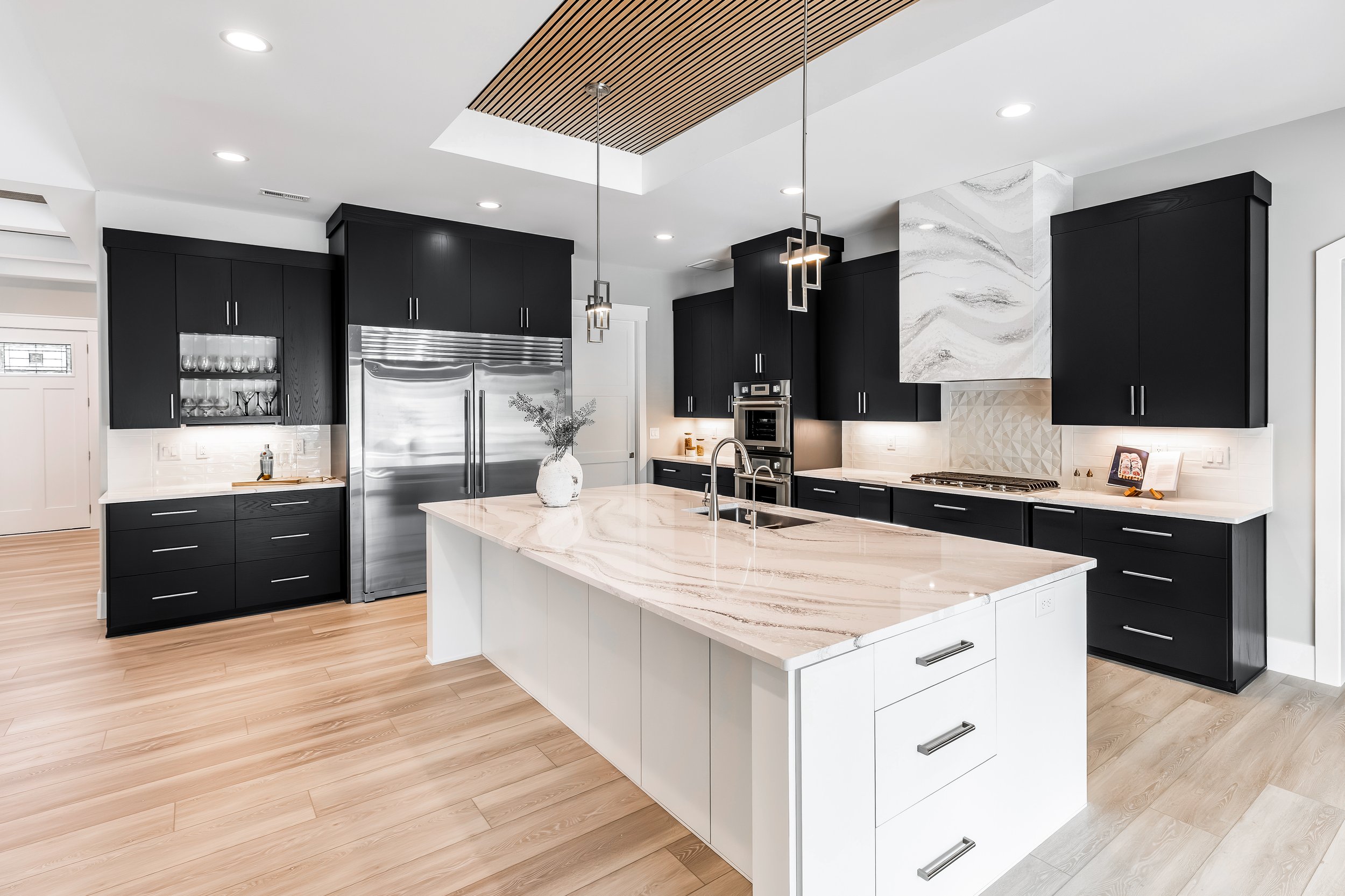 Black cabinetry and a slatted-wood ceiling tray framing the island add character and depth to this Studio Lee kitchen. Subtle monochromatic veining in the countertop bridges the gap between light and dark beautifully.